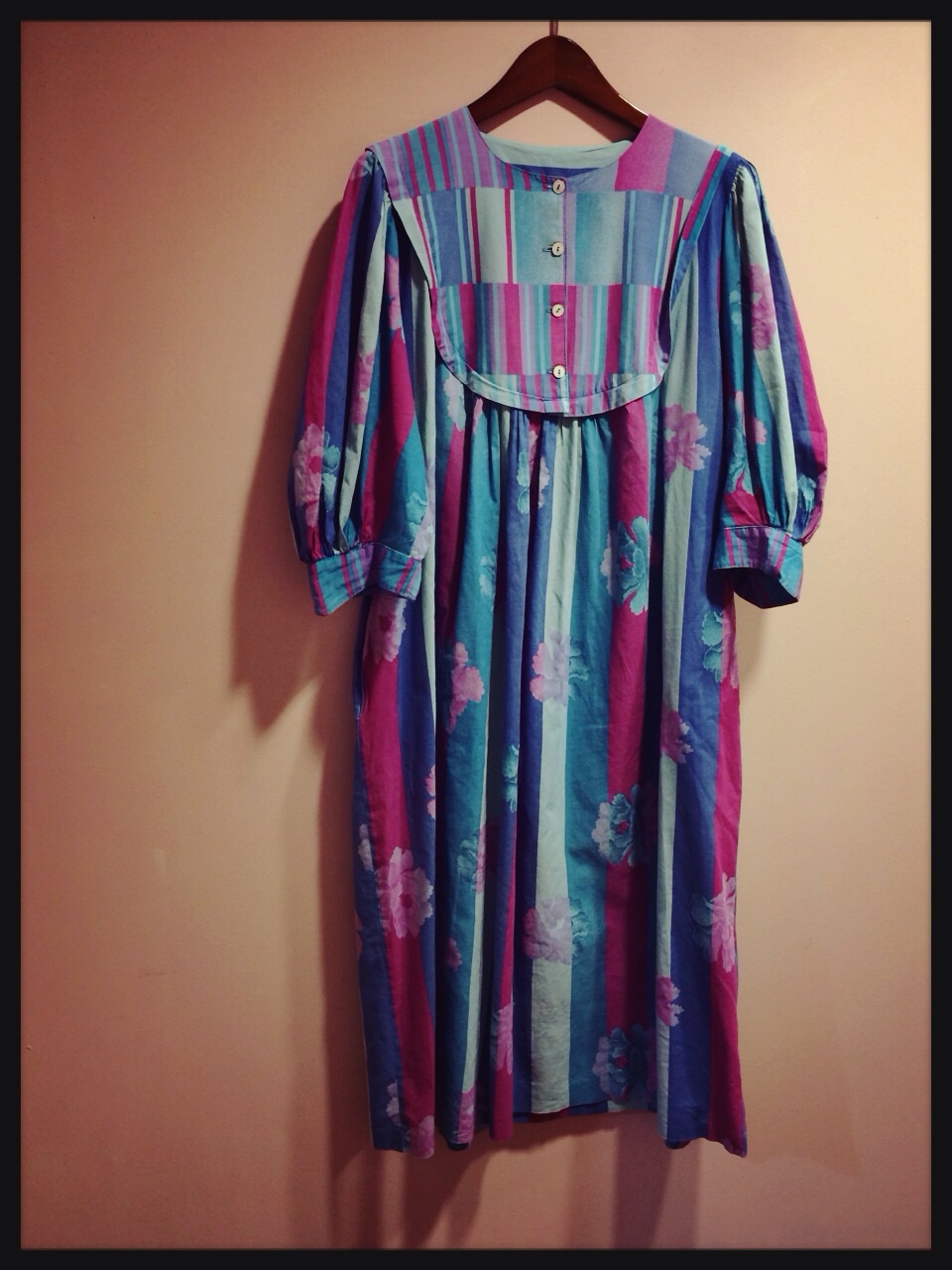 胸したからのギャザーでふんわりしたテザインのワンピース(^_^)ストライプと花柄です♪
