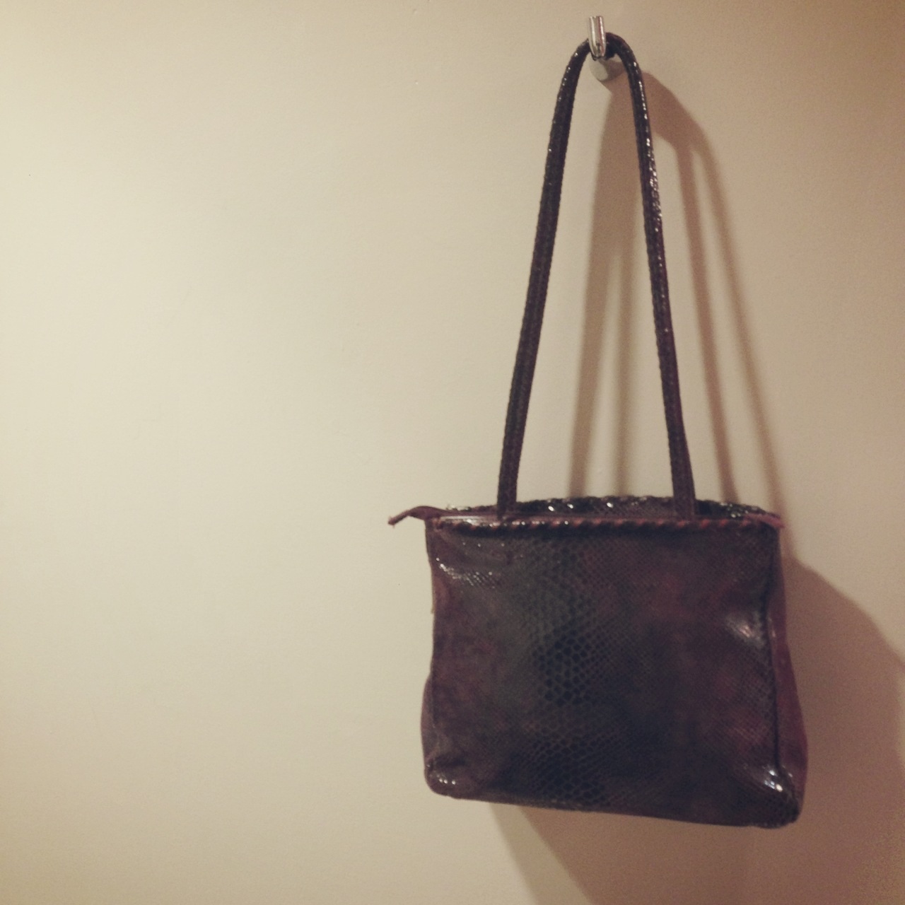 赤系で光のあたり具合でピンクにもパープルにも見えます。可愛いくもクロコダイルのような柄で格好良さも感じられます