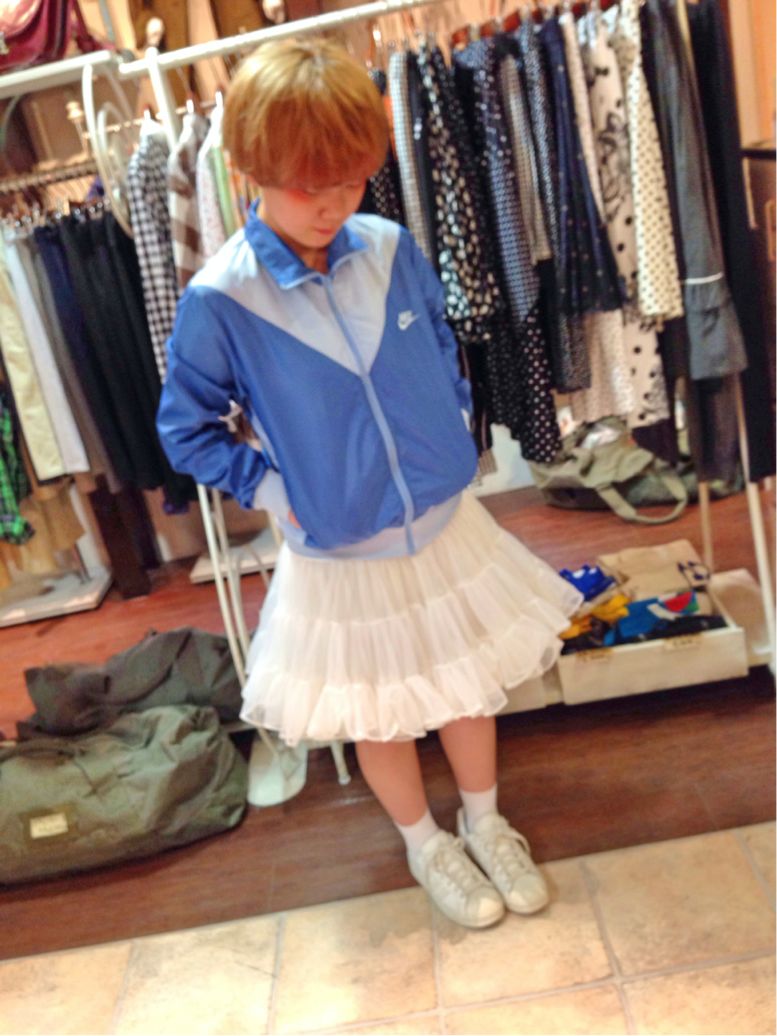ブルゾンとスニーカーのスポーティな組み合わせにはずしとしてパニエを(^◇^)!