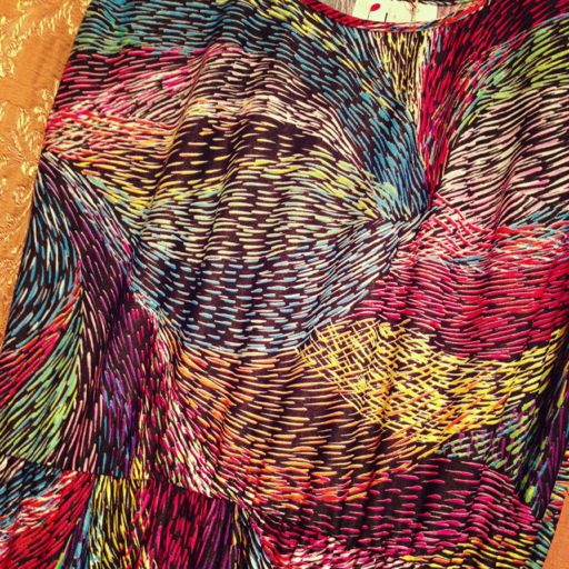 花火のような、孔雀の羽のような模様の色合いが可愛いワンピース(^_^)