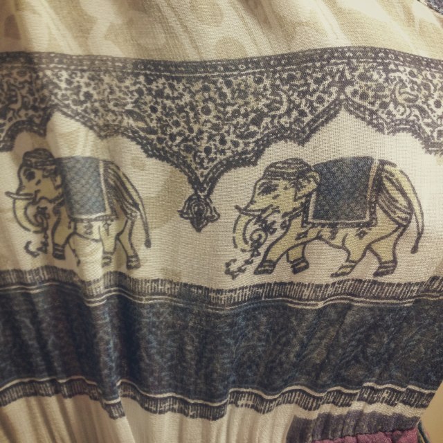 こちらもベルト付きで、赤ベースのカラフル柄です