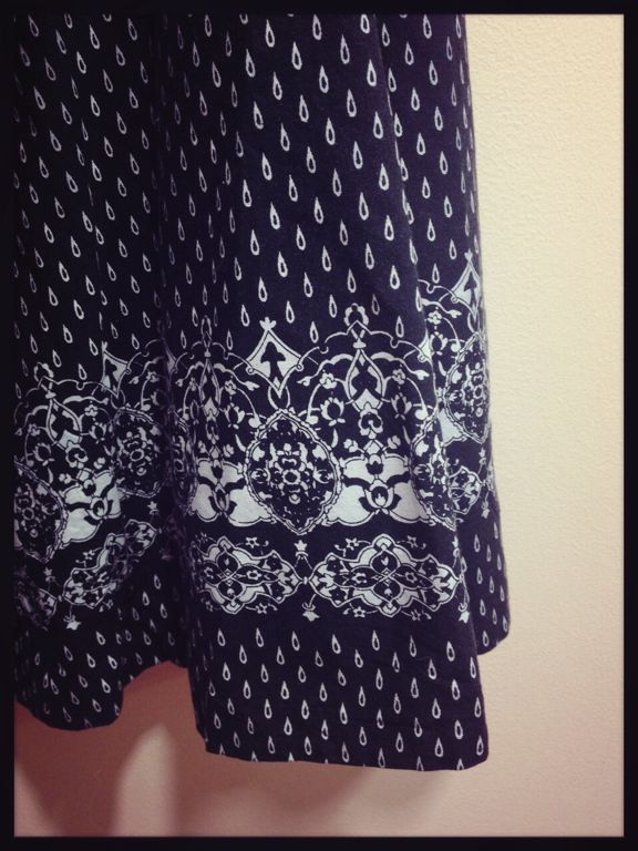 裾の細かいプリントと腰でしばれる