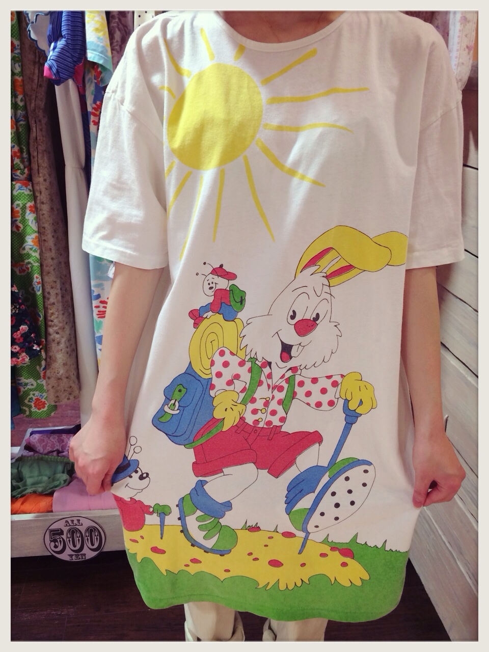 ハイキングしているウサギさん柄のTシャツワンピ♪全面プリントがインパクト大です!