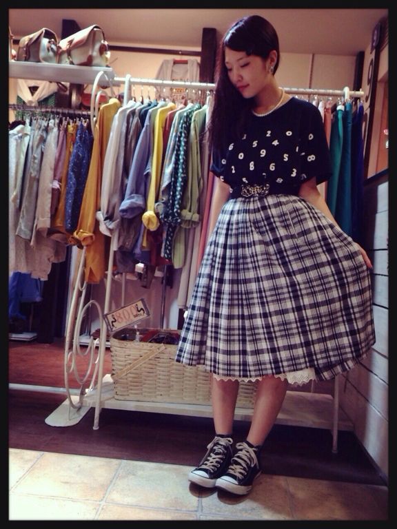 ギンガムチェックにシンプルなTシャツを合わせてカジュアルコーデに♪