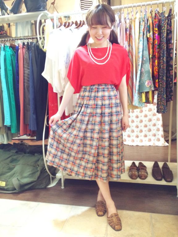 赤い花とかすれたようなラインがレトロっぽいスカートです!
