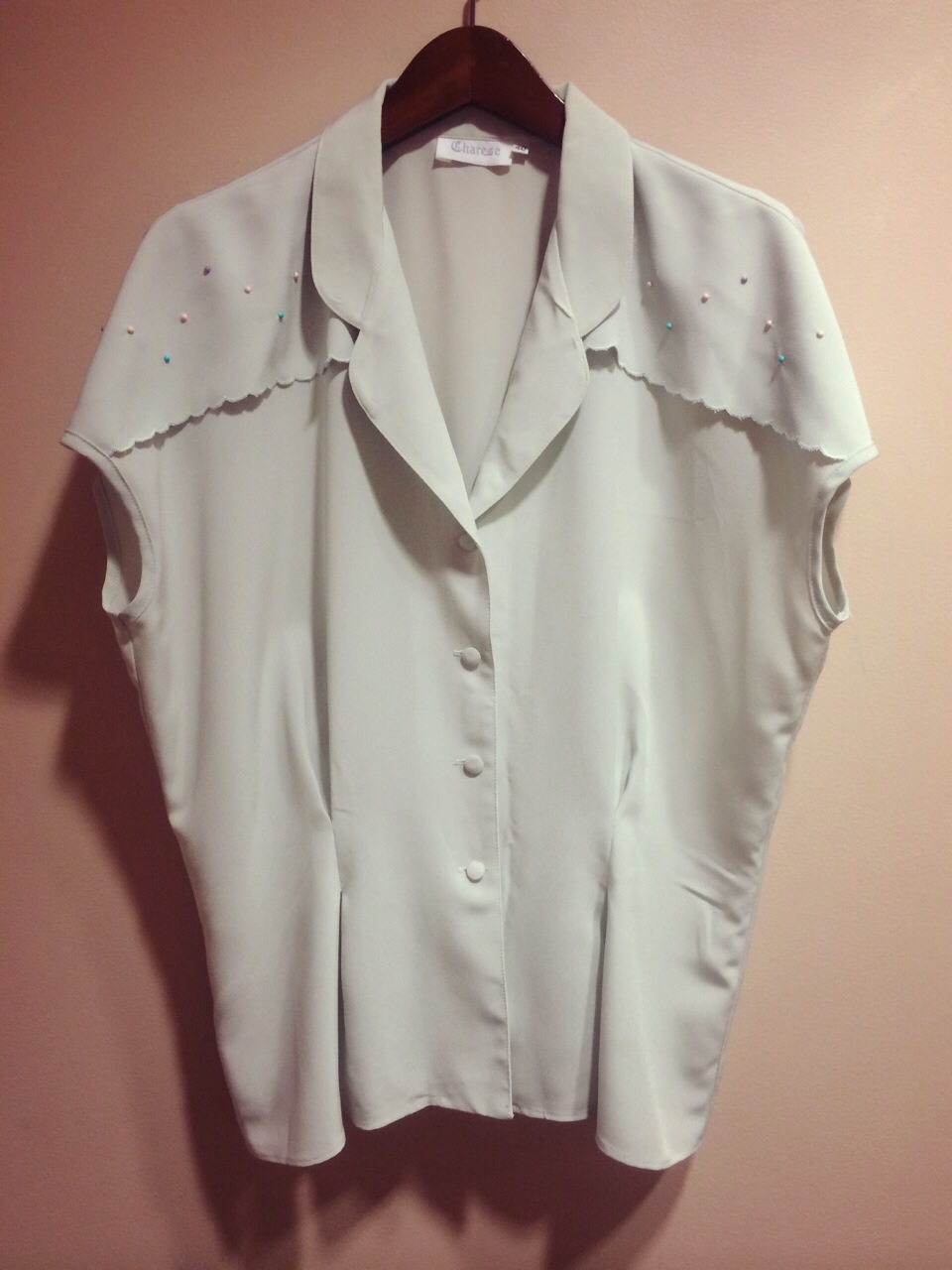 ドットがかわいい水色のシャツです!