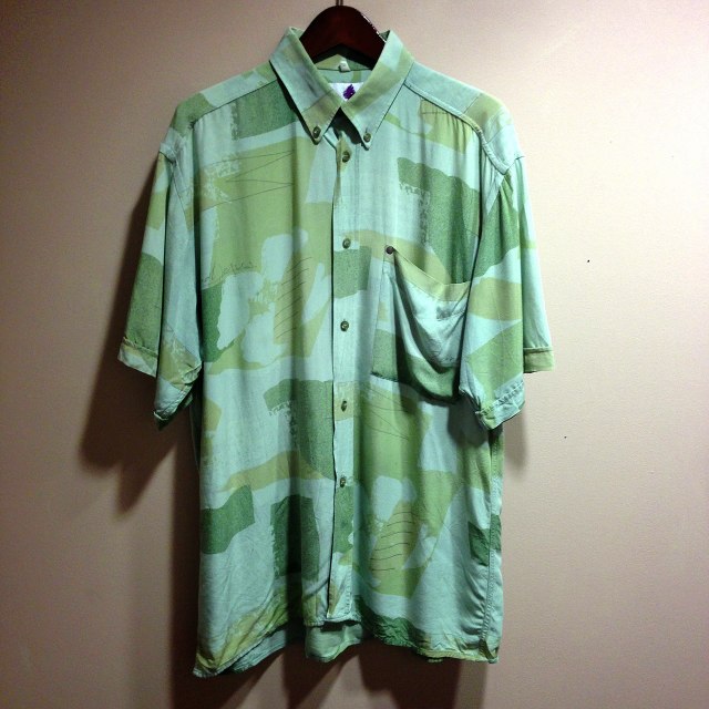 グリーン柄。ゆったりとしたサイズ感が◎ラフに緩めのパンツと合わせても、シャツインしてハイウエストでボトムスとも合わせやすい色合い