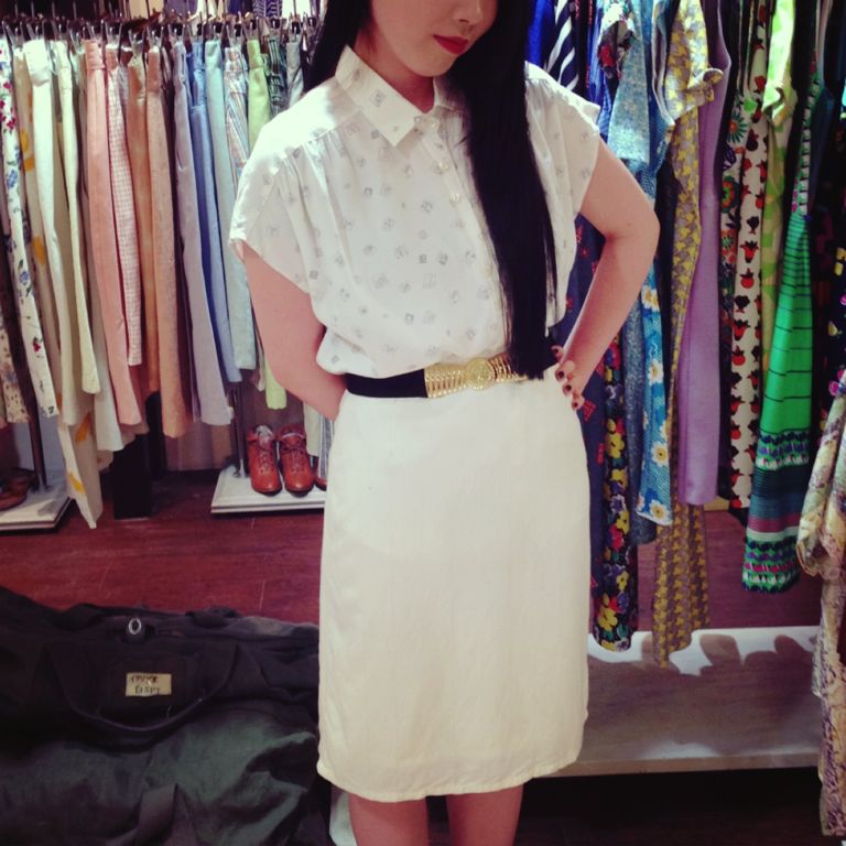 ボトムスも白タイトスカートでまとめてベルトでキュッと印象付けたおねえさんコーディネート