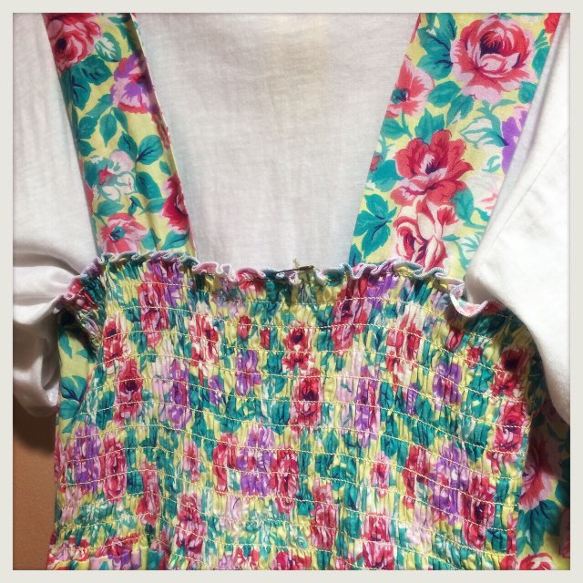 白Tシャツと重ねた、花柄のエプロンワンピース◎背中がシャーリングのゴムになっているので着やすいです♪