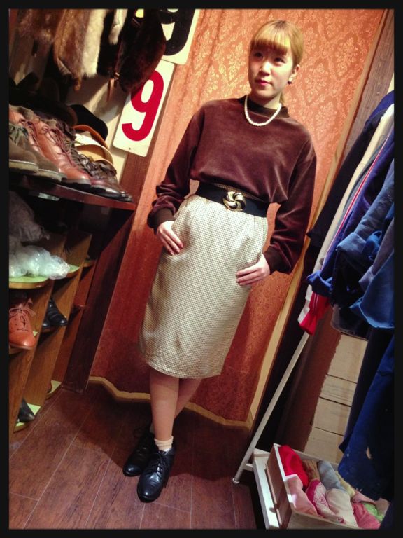 ベージュ系のチェックタイトスカート◎茶色のベロアトップスでお姉さん風に♡