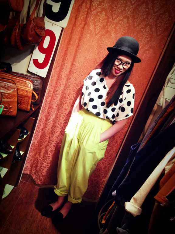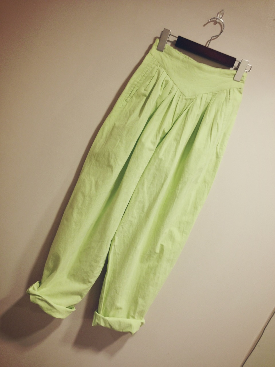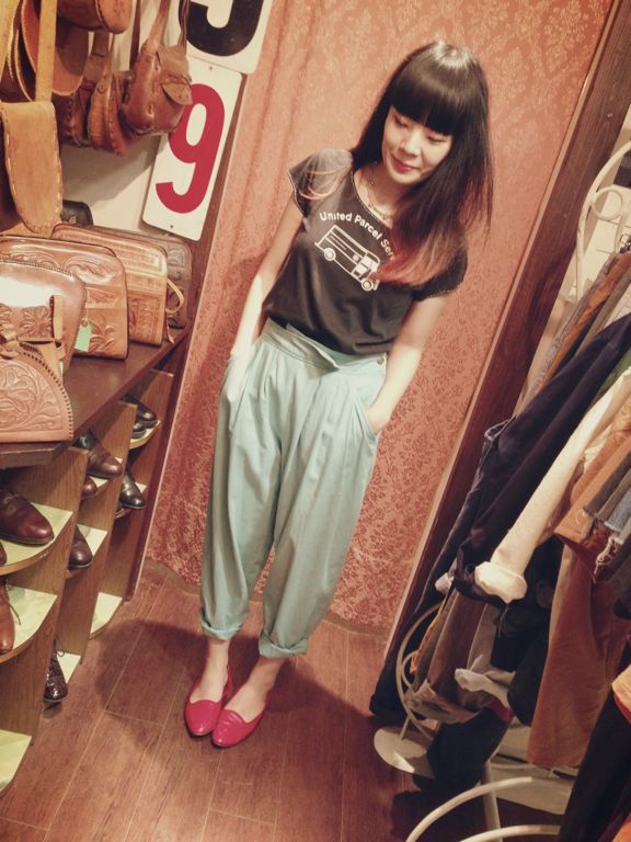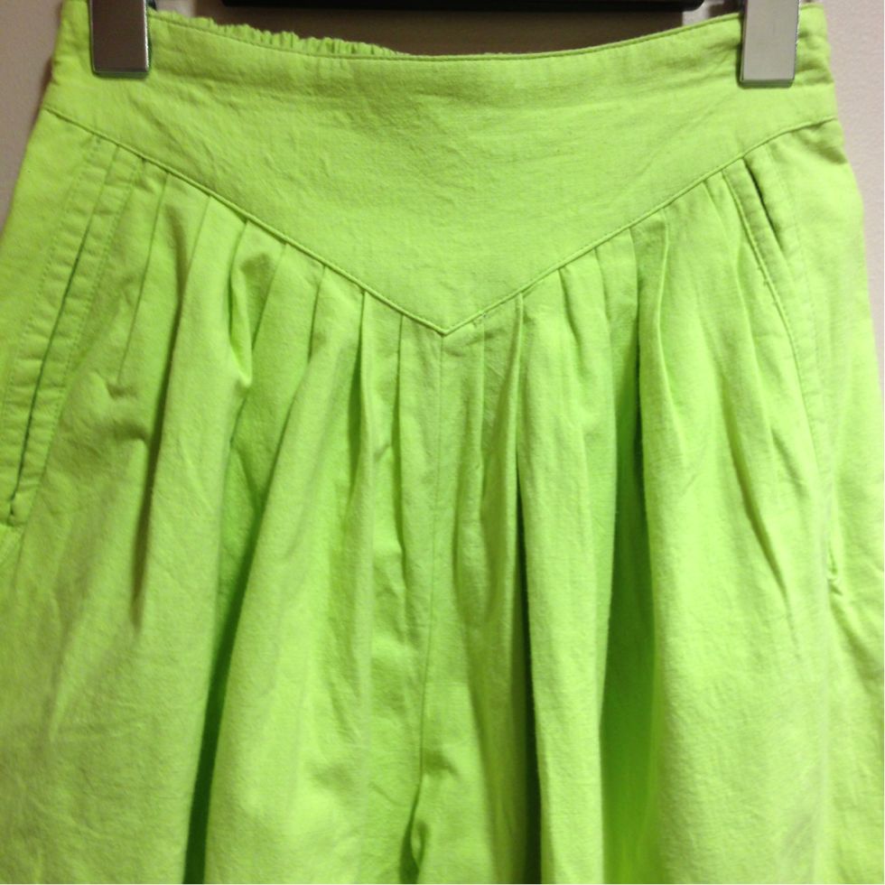 明るめイエローです。こちらのパンツは全体的にボリュームがありますのでぴったりめのトップスでボリュームおさえると◎あえてトップスもダボっと着るのも◎