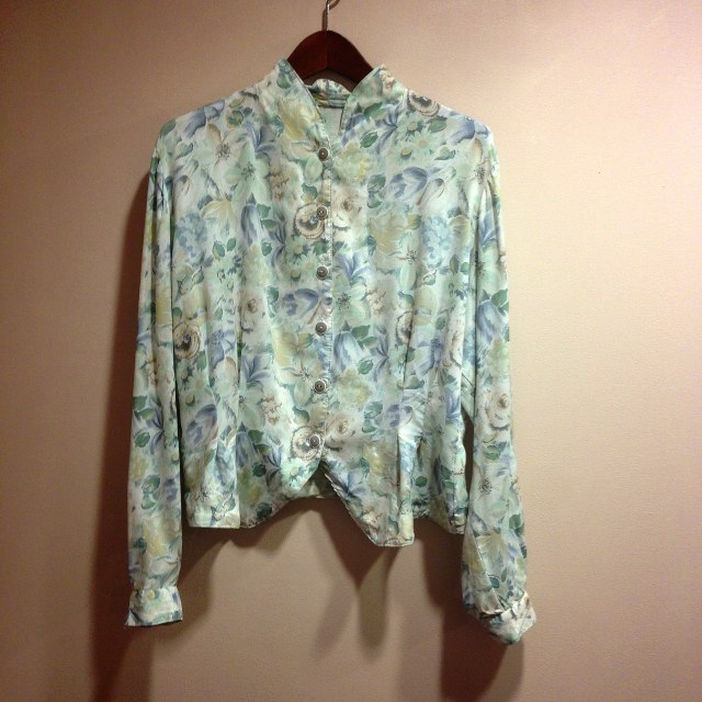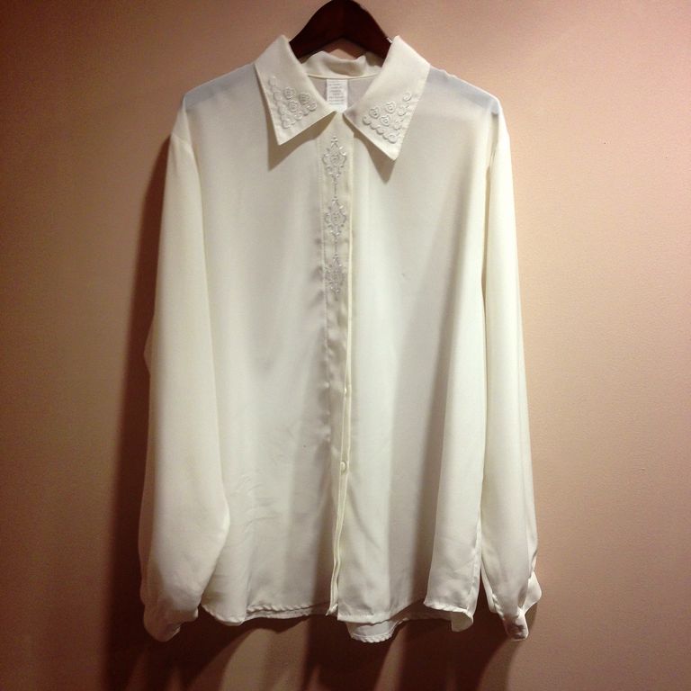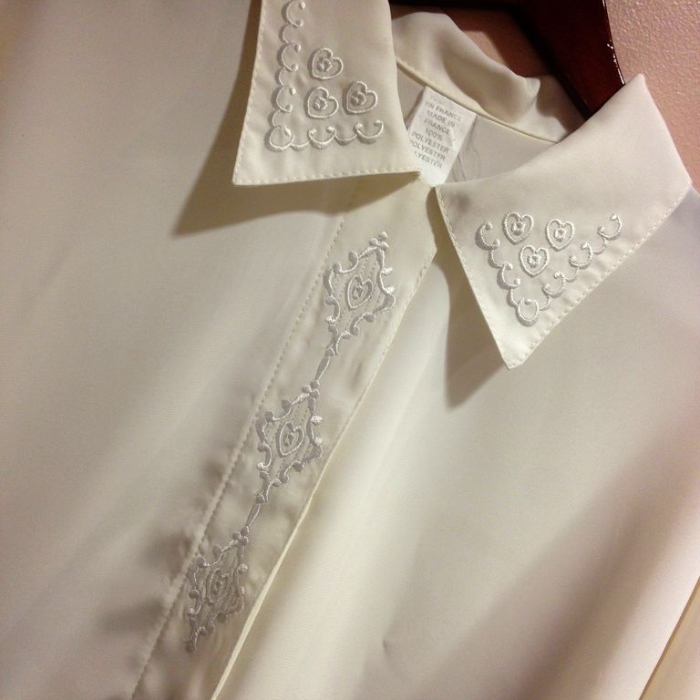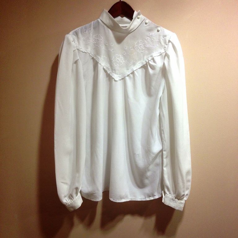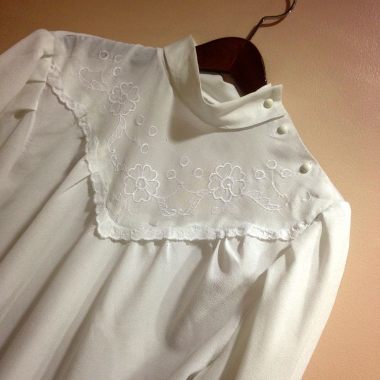 ハイネック、肩ボタンタイプ。パフスリーブですのでクラシカルな印象に。お花の刺繍が素敵です♡