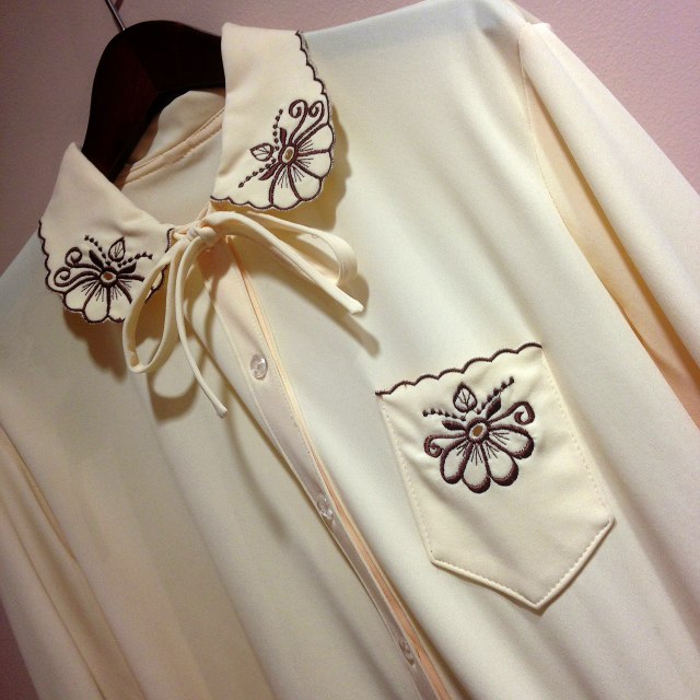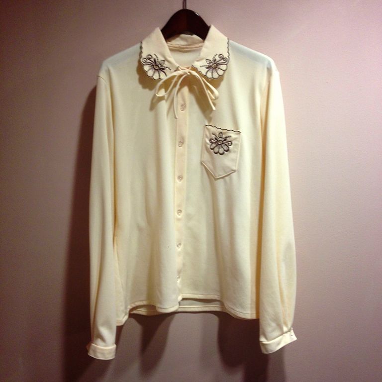 優しいクリーム色。茶色の刺繍が綺麗めに、リボンで可愛いらしくも見せてくれます♡胸ポケットがポイント
