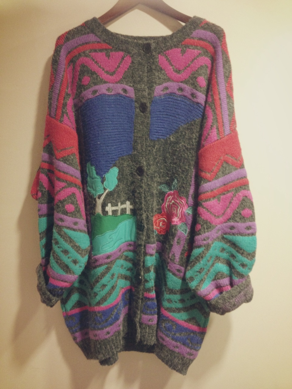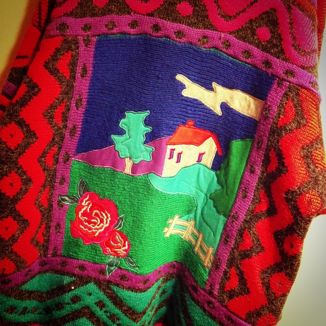 カラフルな柄が印象的。背中には素敵なバラとおうち