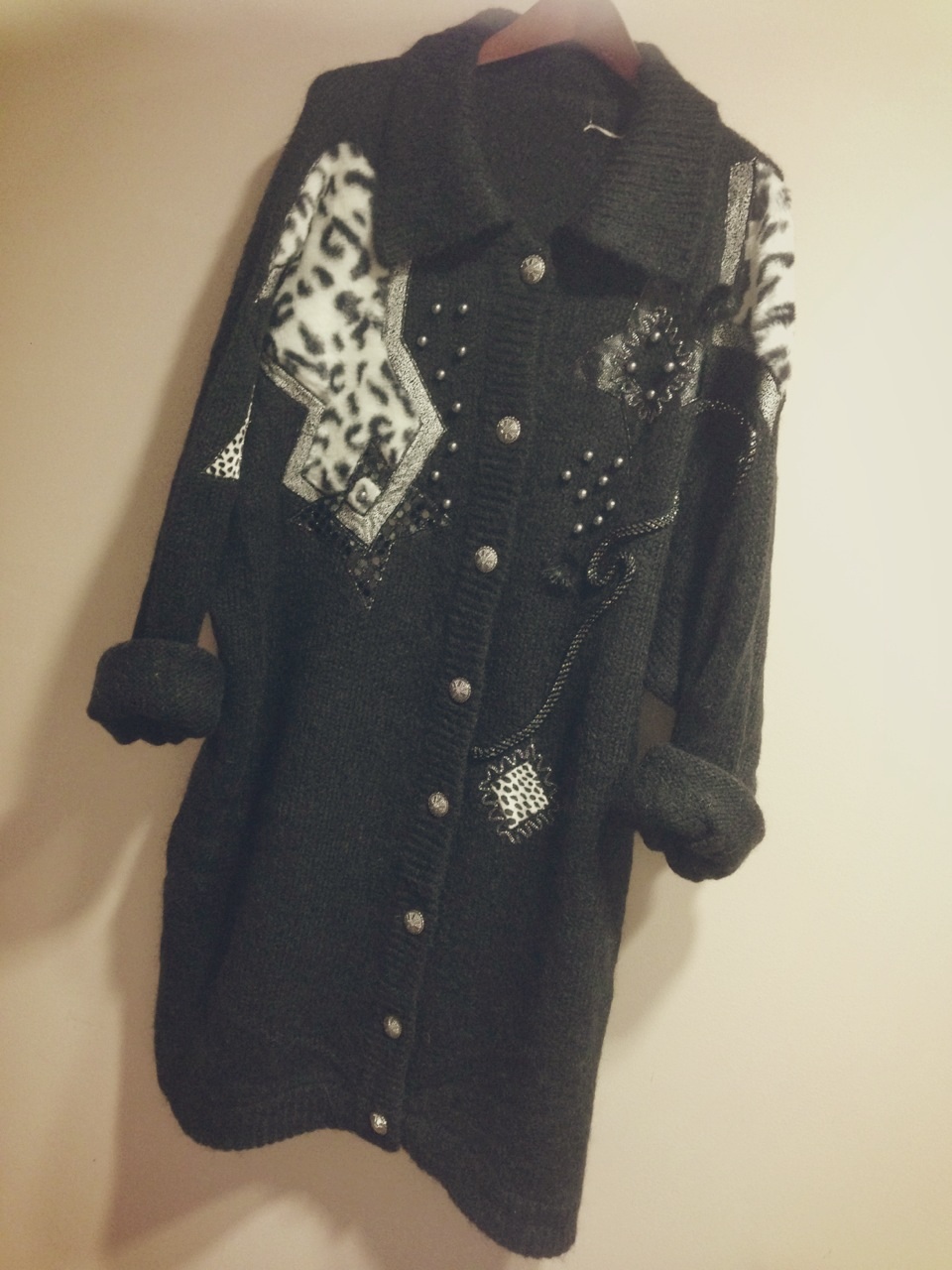 裏地付きのしっかり素材で丈長めです。ファーのヒョウ柄がポイント