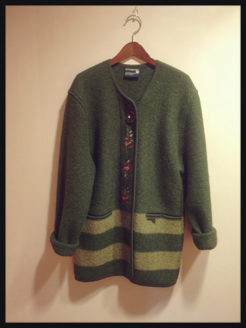 真ん中に鹿とリスなどの刺繍◎裾がボーダーでかわいいです(^ ^)♪こちらもウール素材◎