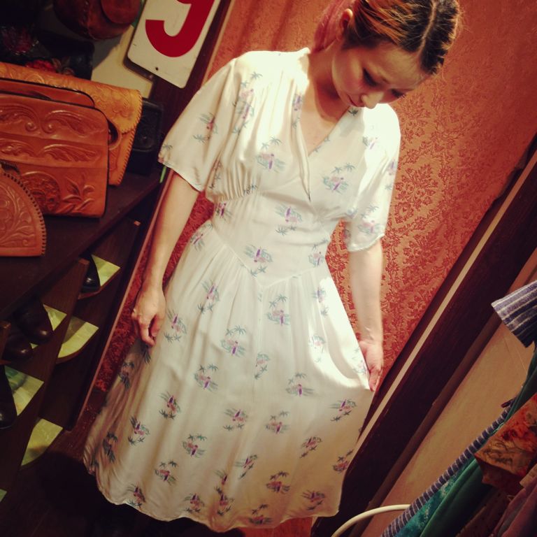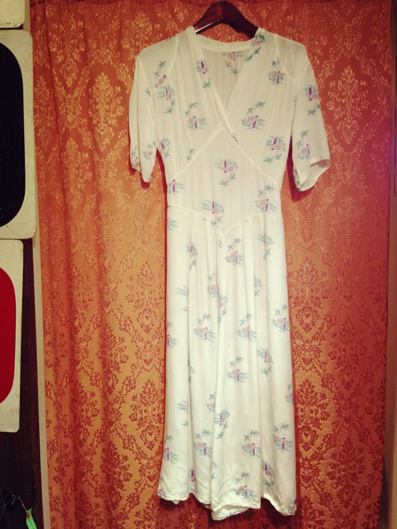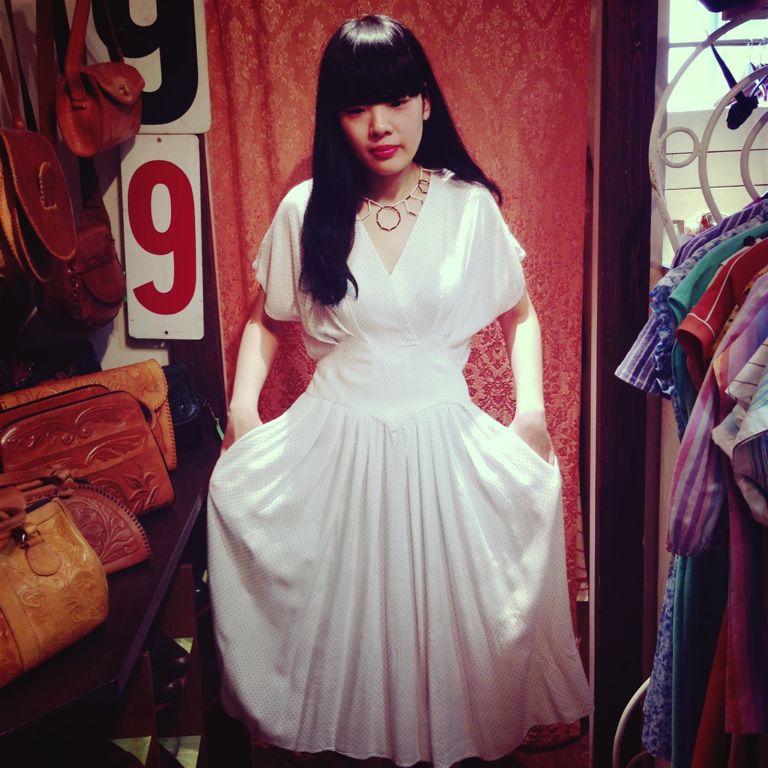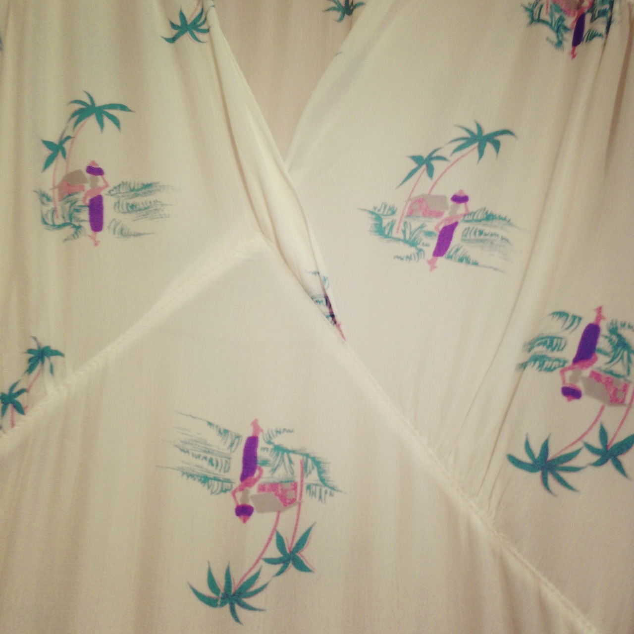 白地にベトナム(?)系な女性がプリントされたワンピース!模様のパステルカラーが可愛い(^_^)