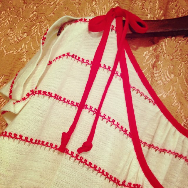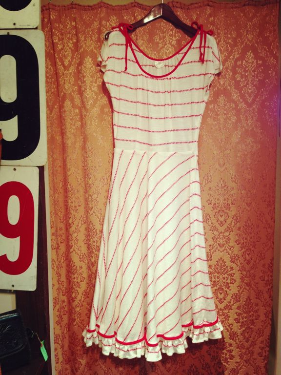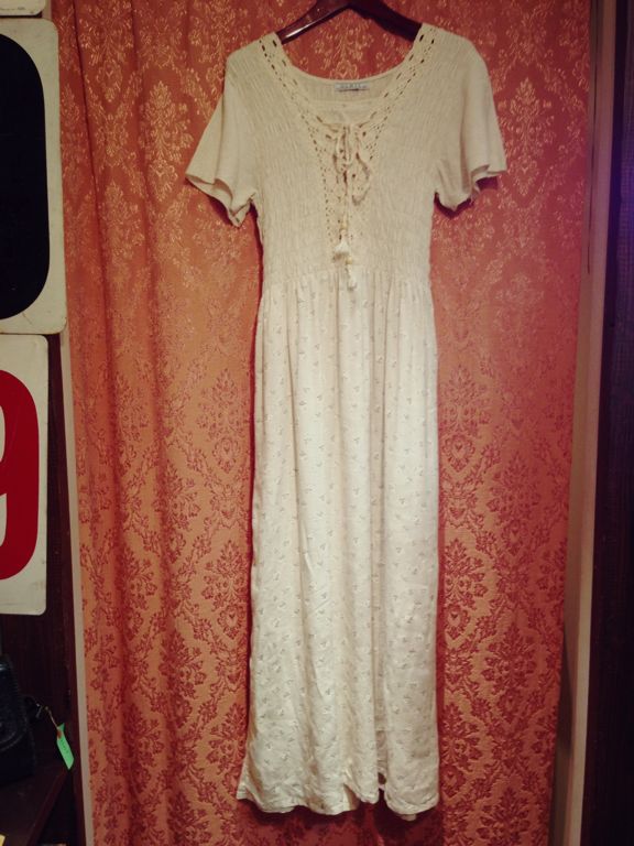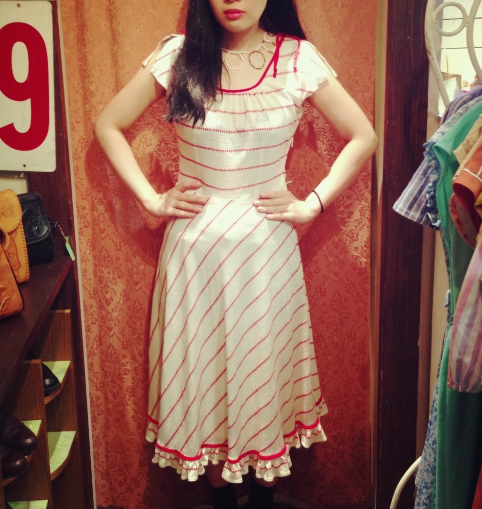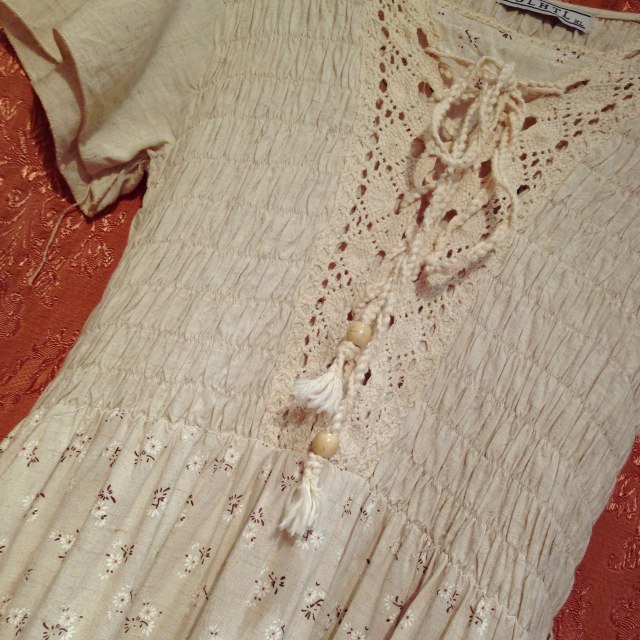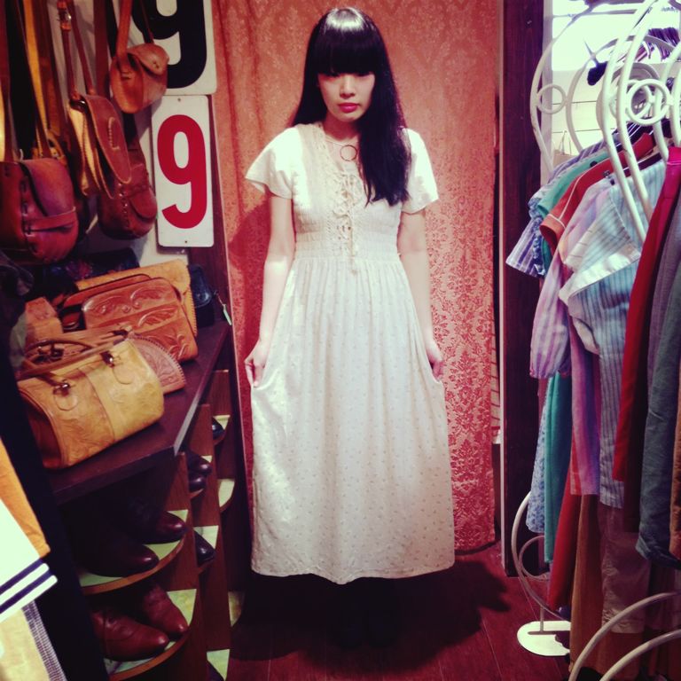 薄い柔らかい生地の少しレトロなワンピース(^_^)裾や肩のデザインが凝っていて可愛いです♡