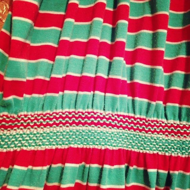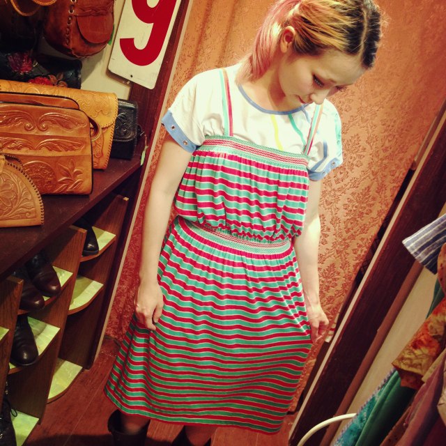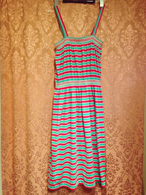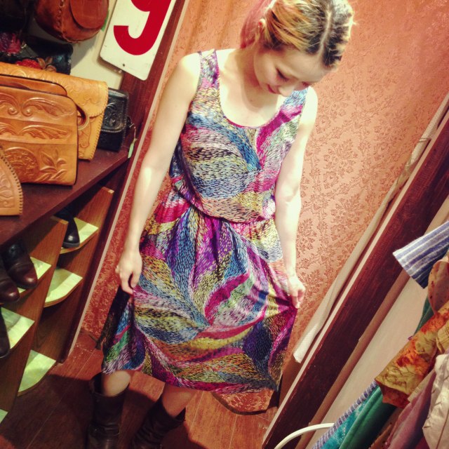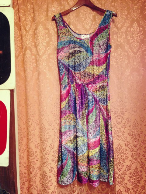 花火のような、孔雀の羽のような模様の色合いが可愛いワンピース(^_^)