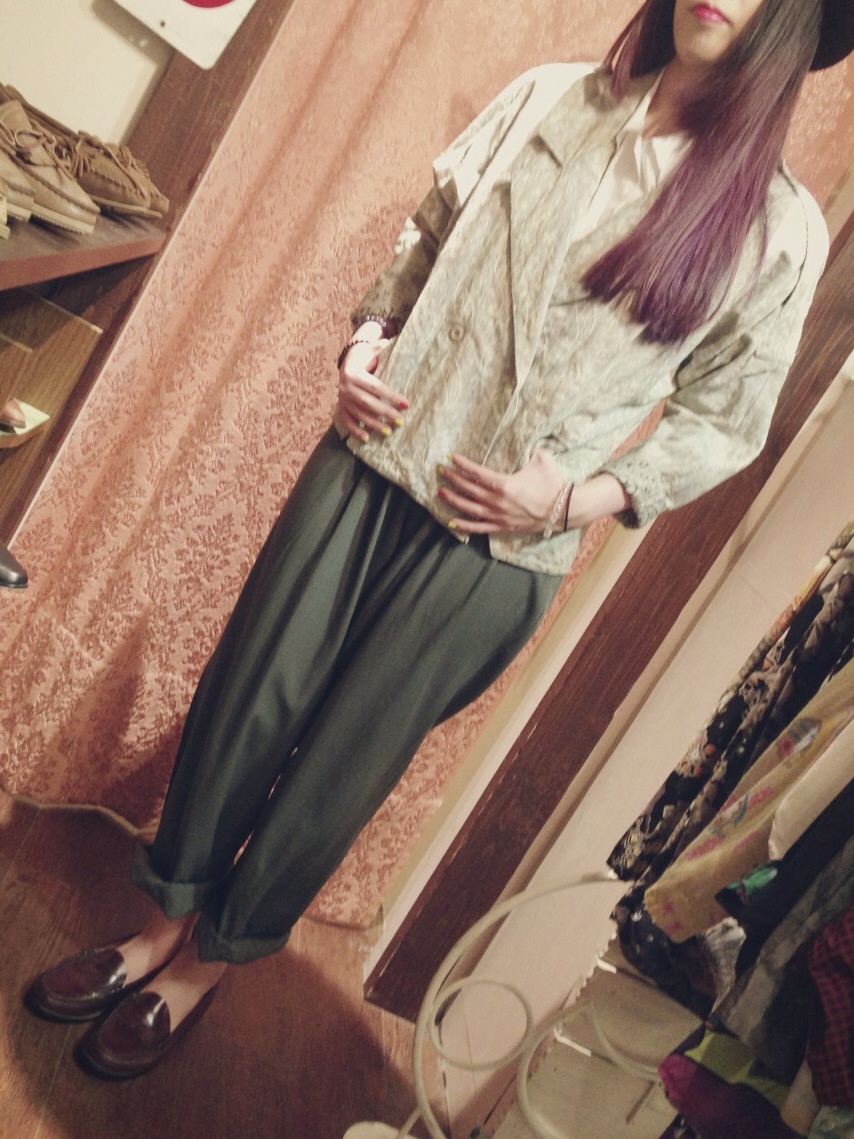 ブラウスとグリーンのパンツで秋らしく落ち着いたコーデにしてみました
