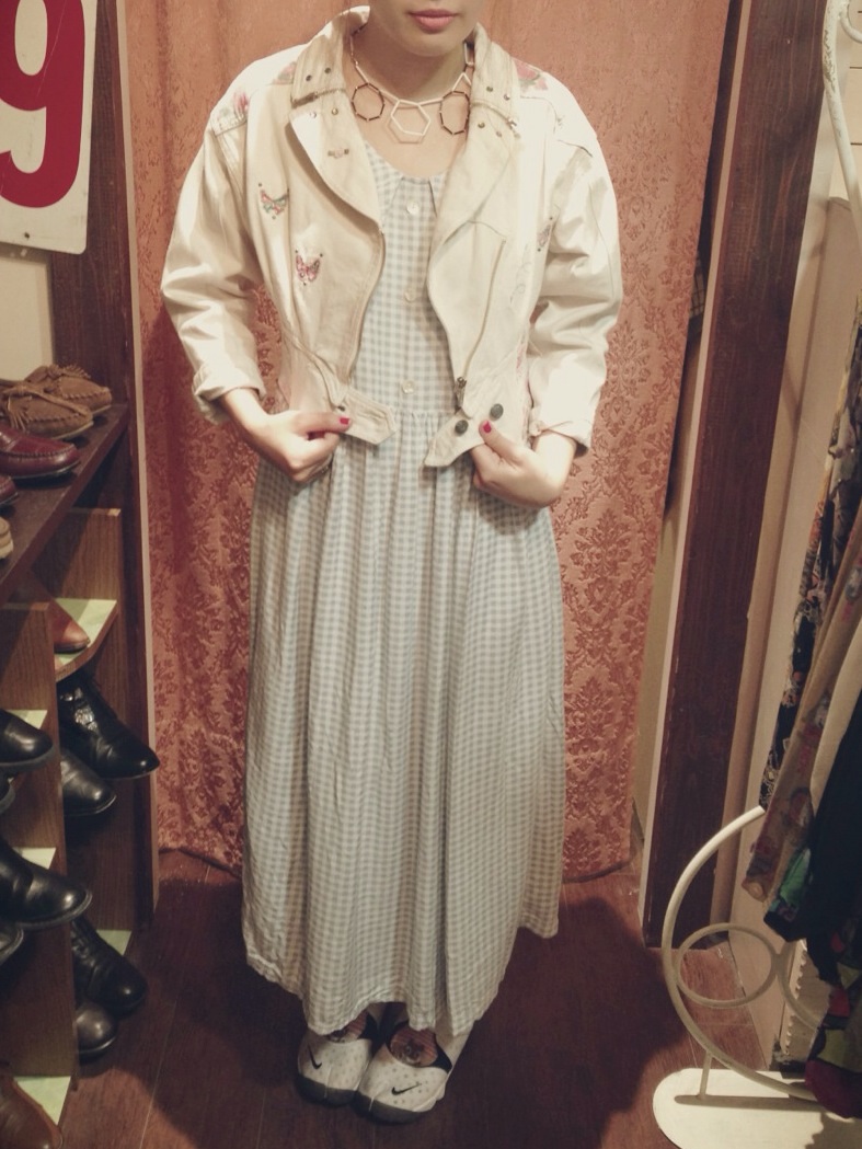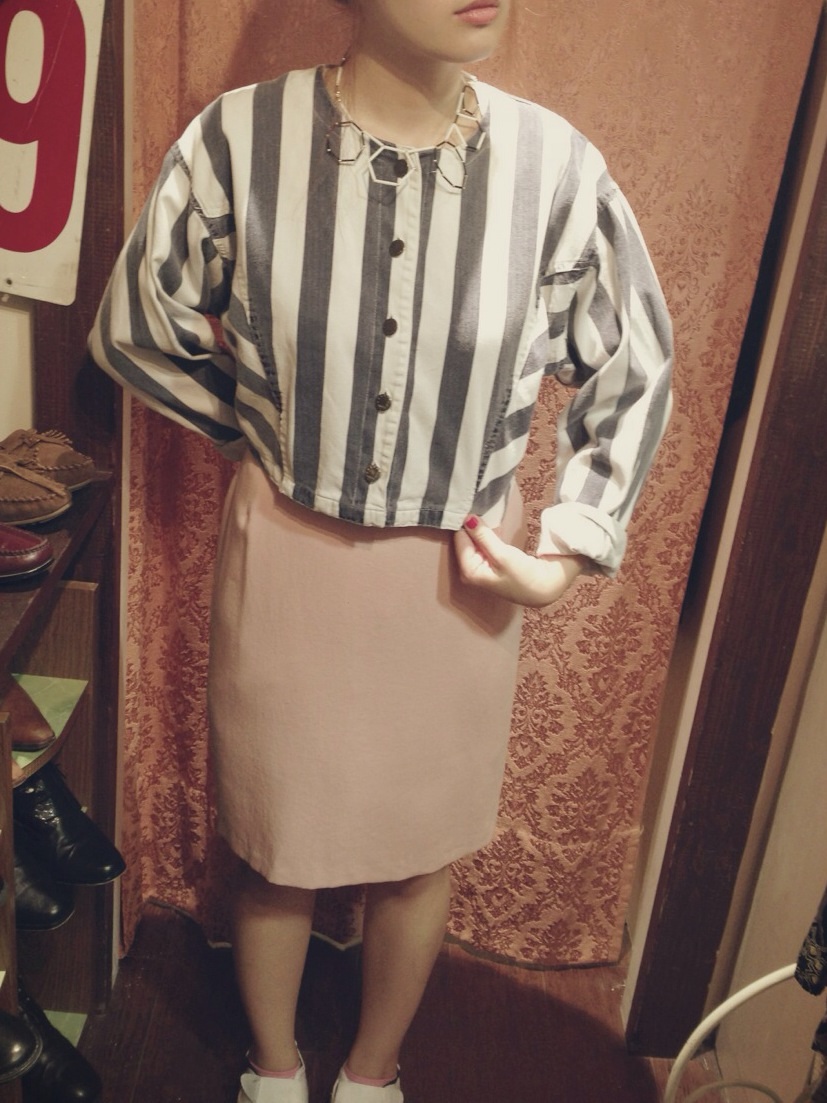 わたくしが着てみますとこのような感じでございます!ショート丈ですので長めボトムスと相性抜群でございます!