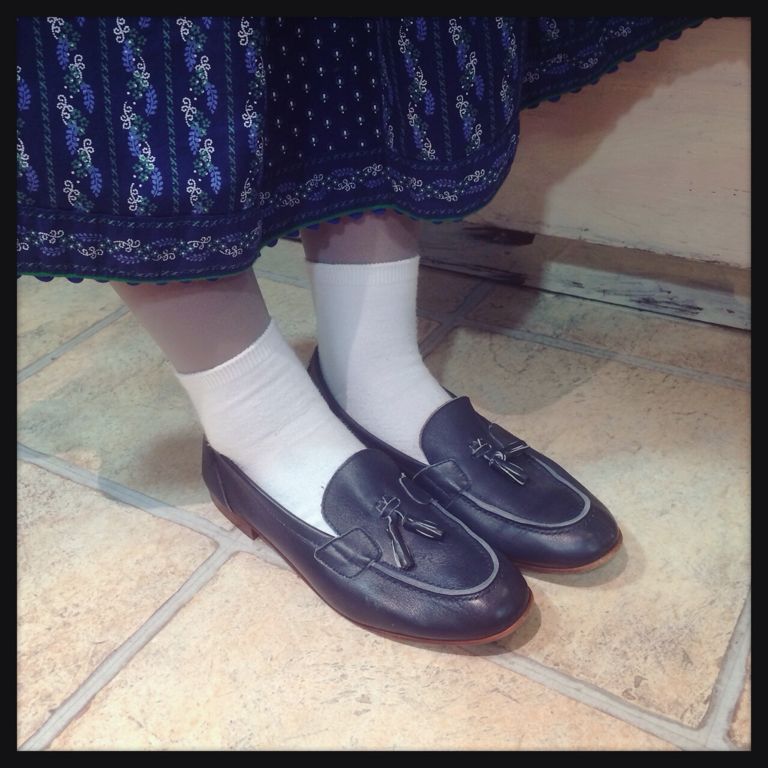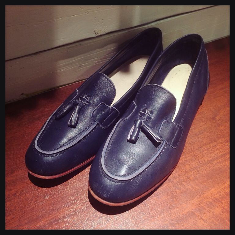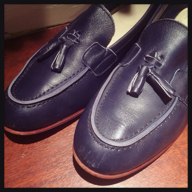 ネイビーのタッセル付きローファー