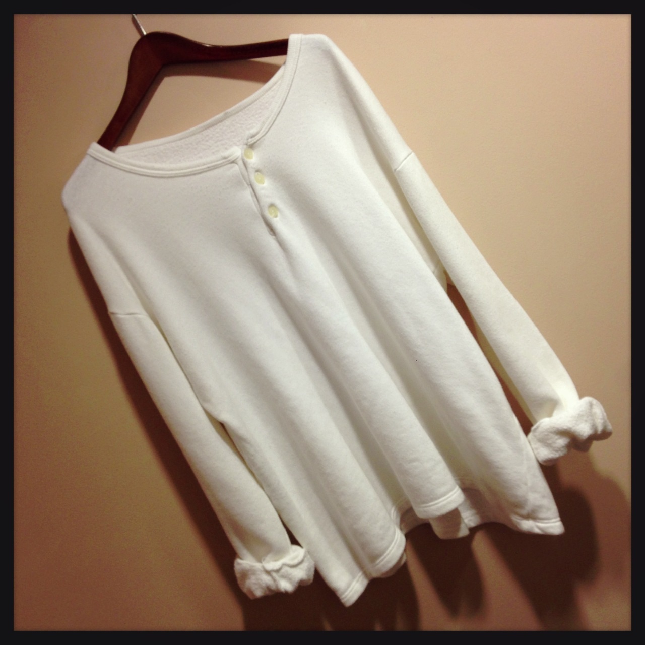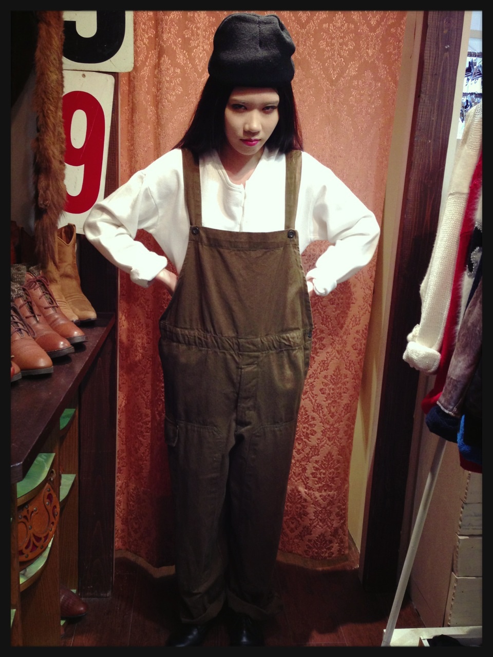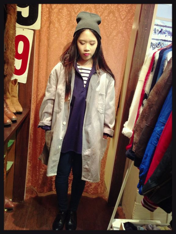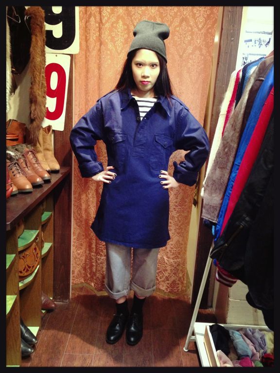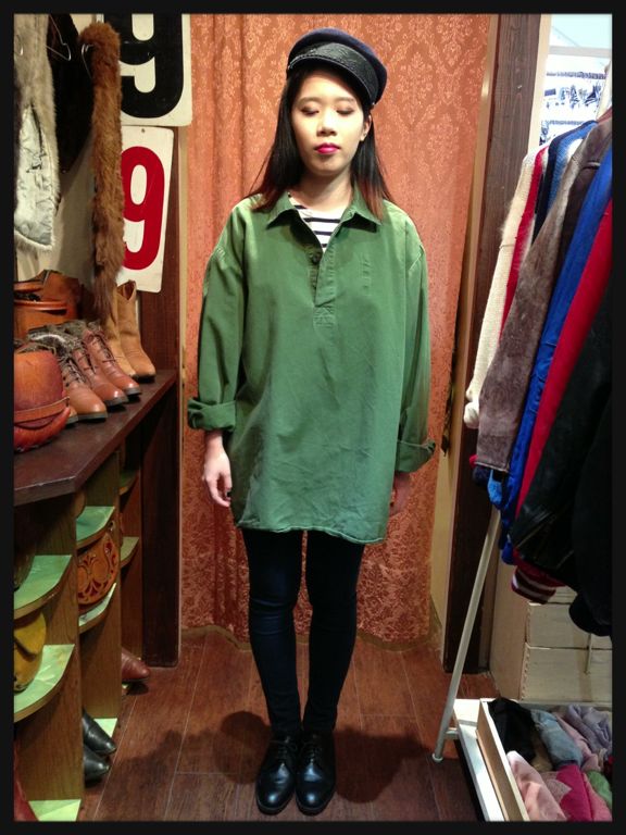 グランパシャツはワンピースのようにも着られる丈感ですのでタイツにブーツなどと合わせても可愛いです。今回は少しゆったりなコックパンツと合わせてみました。