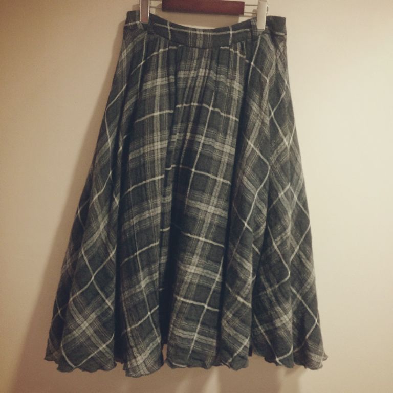 グレー系チェック。裾がボリューミーで可愛いらしいシルエットになります