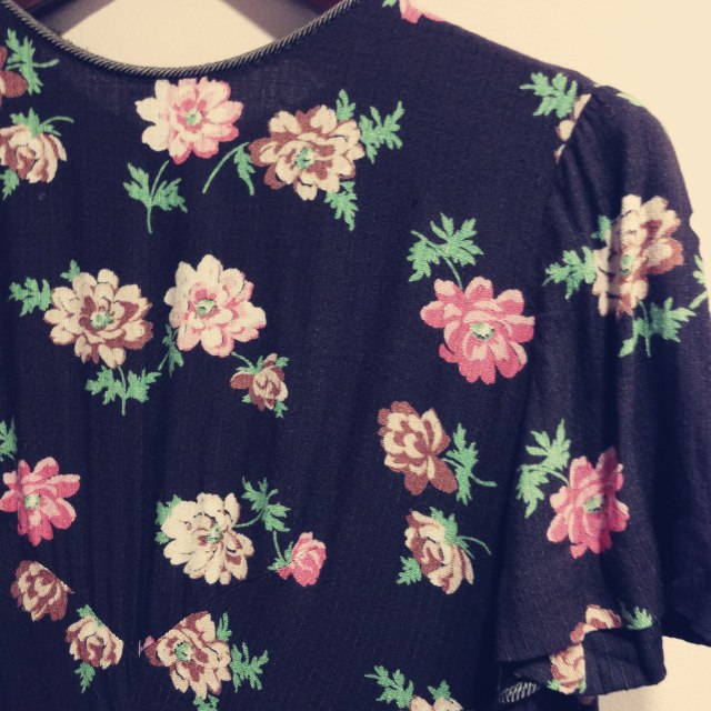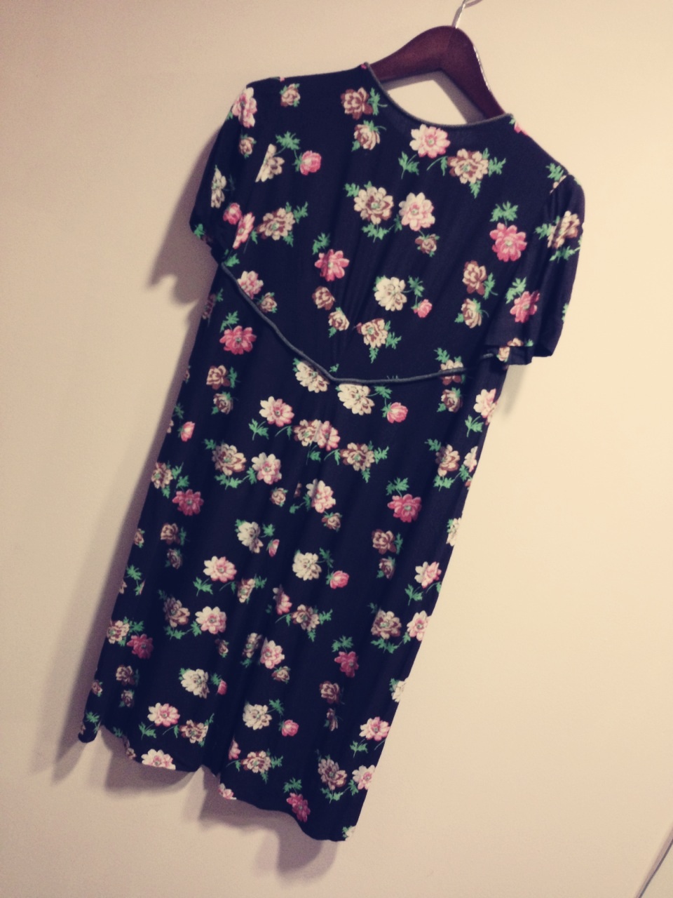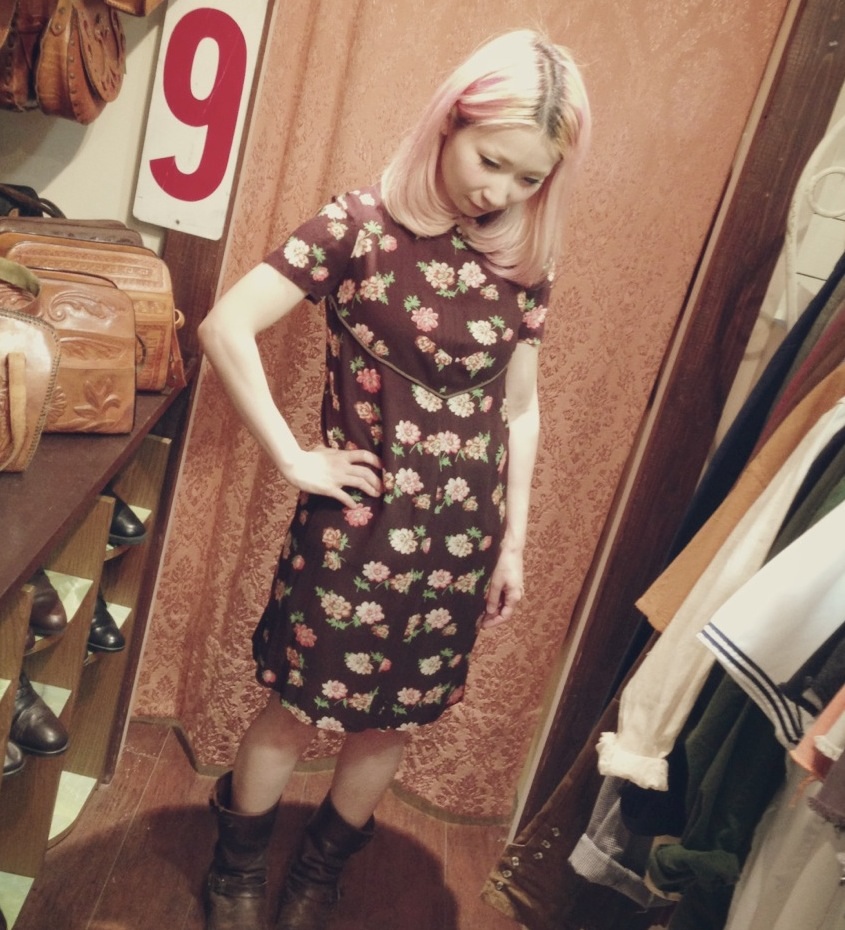 茶色地に花柄のワンピース♡レトロなシルエットのデザインです(^_^)