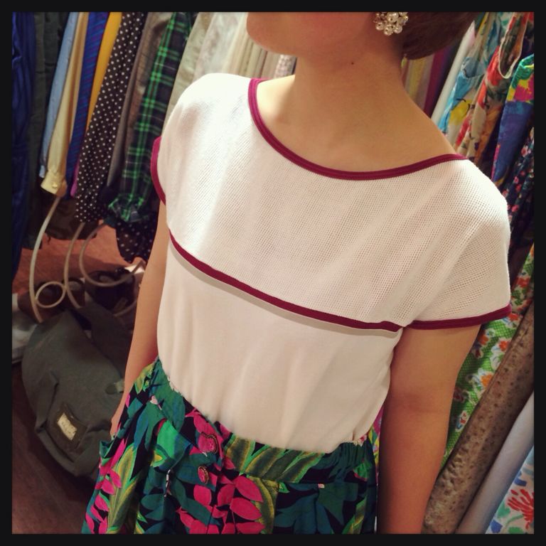 えんじ色のラインがシンプルなTシャツ☆スカートに派手な柄をもってくると良い感じ♡