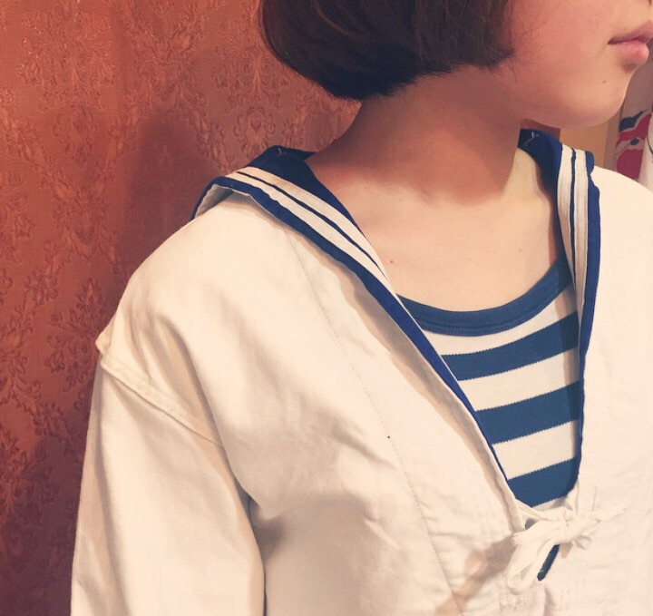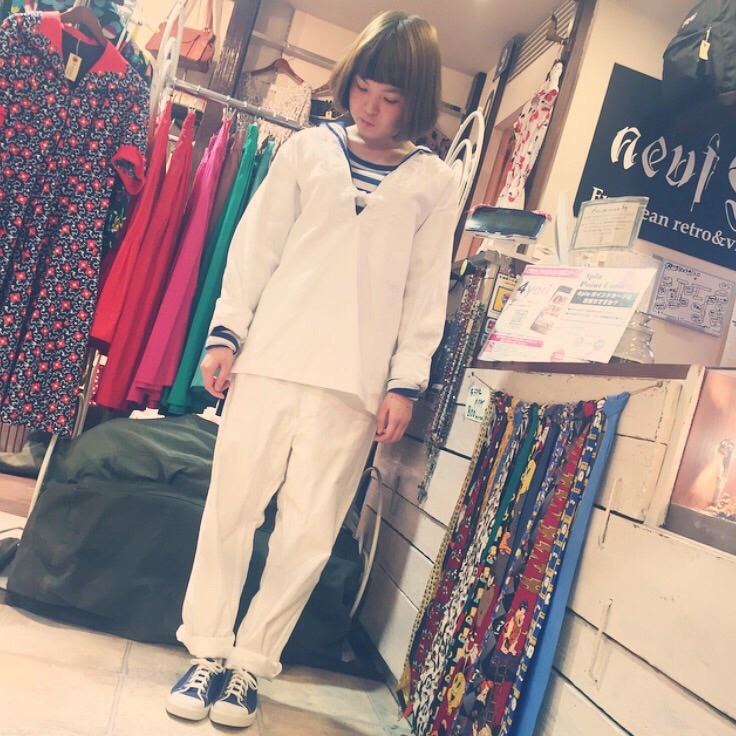 セーラーカラートップスに白のパンツで少年のようなコーデに☆