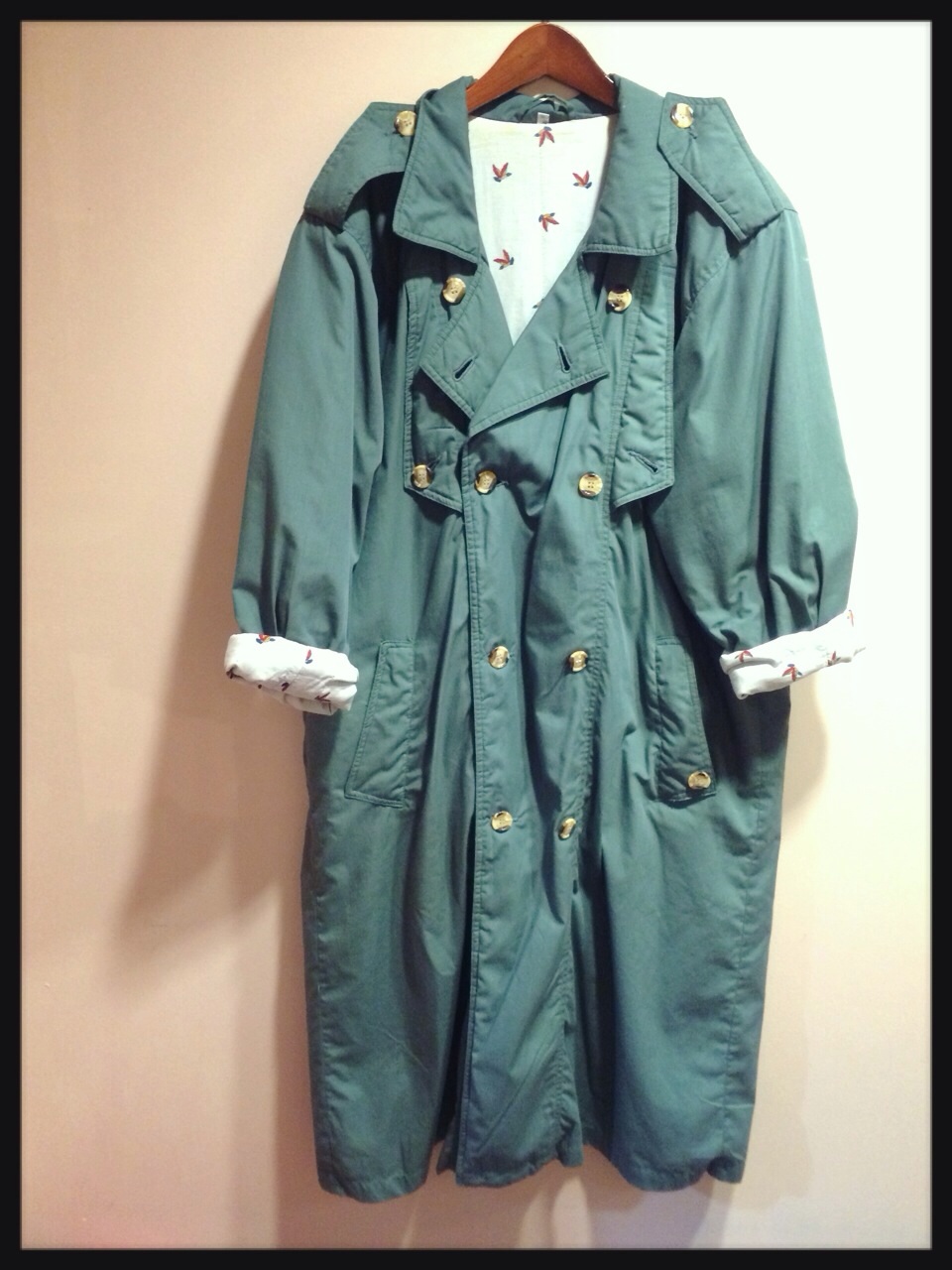 中綿が入っているのでトレンチですがあったかいです^ ^!裏地が鳥柄なのがひじょうに可愛い♡