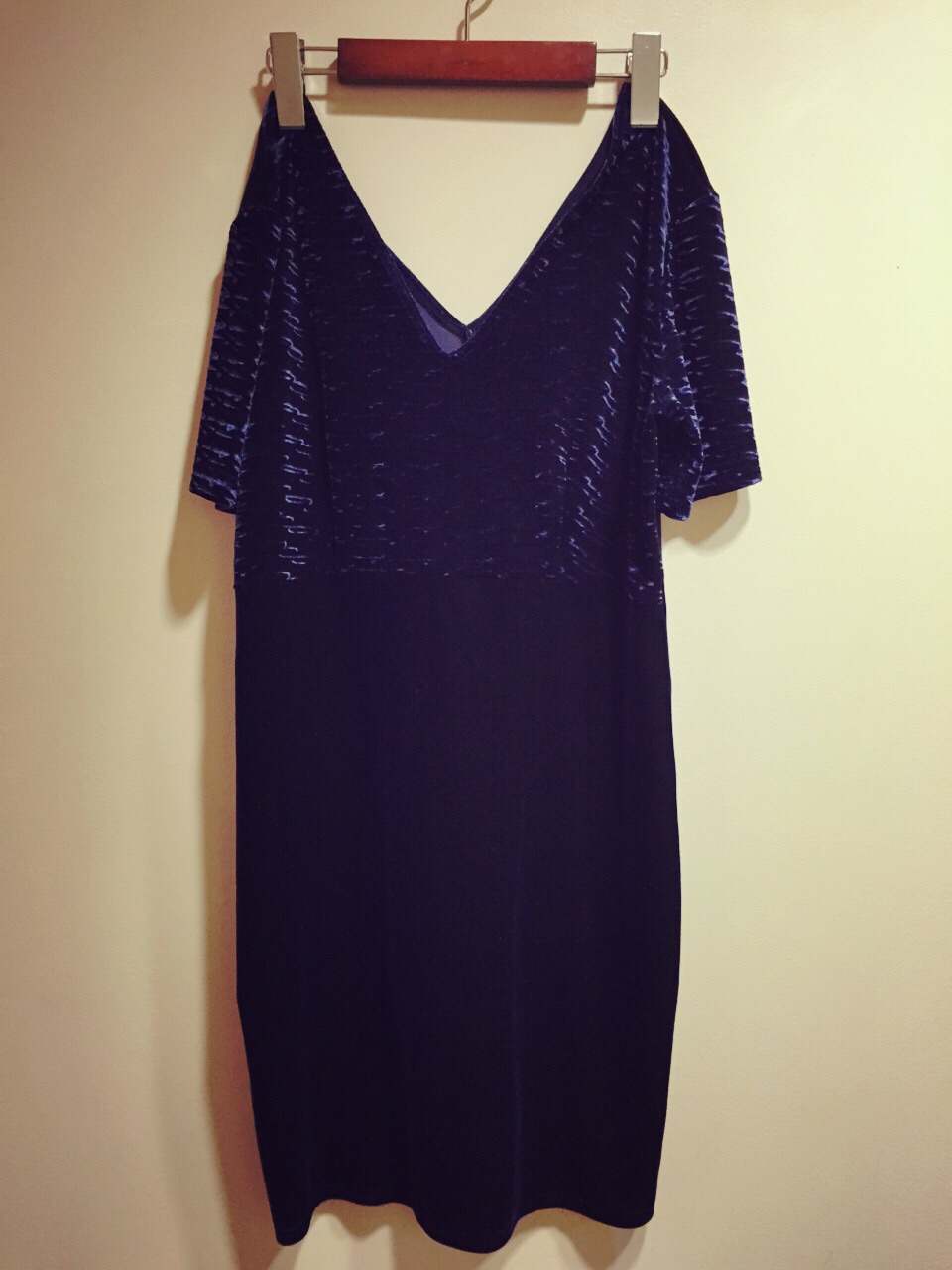 ネイビーのベロア素材のワンピース。
