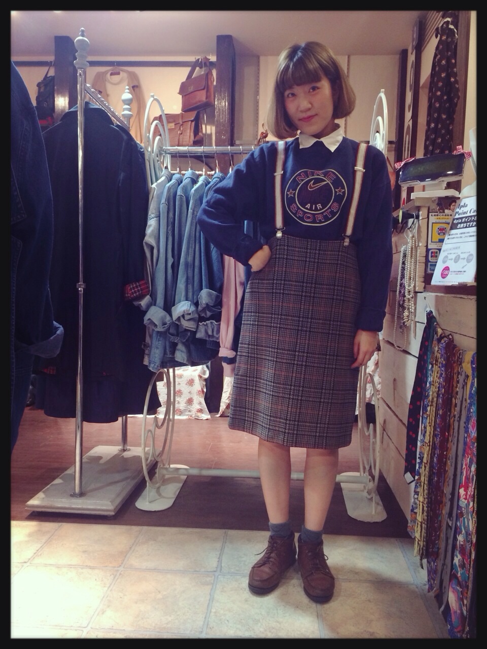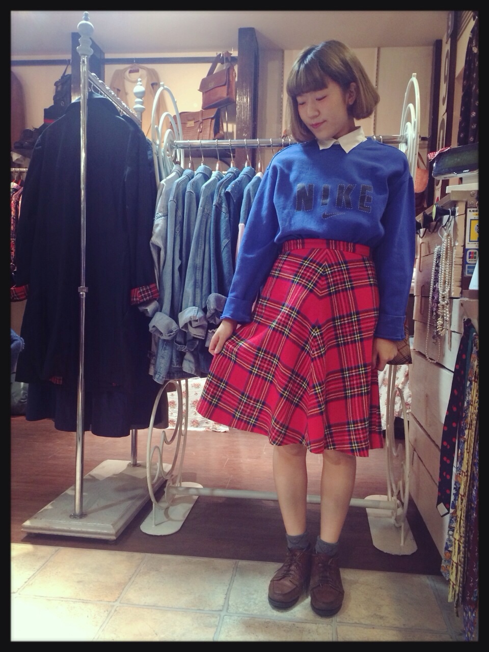 切り取り線のようなNIKEロゴが可愛い青スウェット(^-^)赤チェックのスカートでPOPに♪