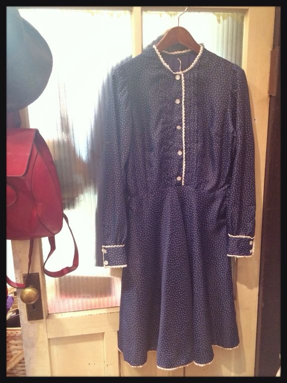 ノーカラーのネイビー水玉ワンピ