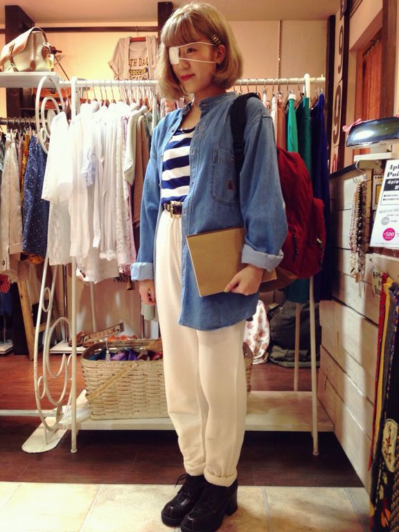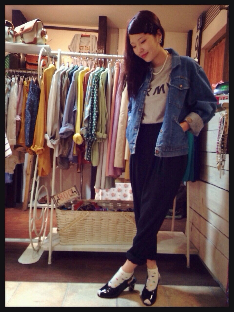 テロっとした素材のパンツに、カジュアルなTシャツとGジャン合わせてラフな印象に♪