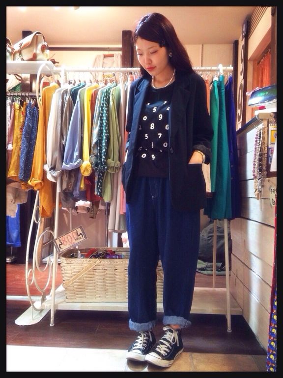 長めのテーラードジャケットに長めのデニムパンツをあわせたカジュアルコーデに♪