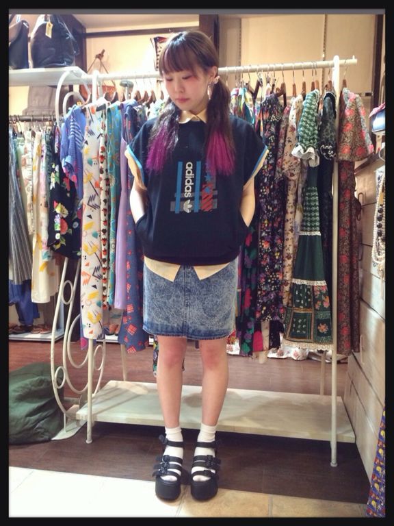adidasの半袖スウェットにストライプのシャツを重ねて柄をちょいみせ(^ー゜)!スポーティなコーデに♪