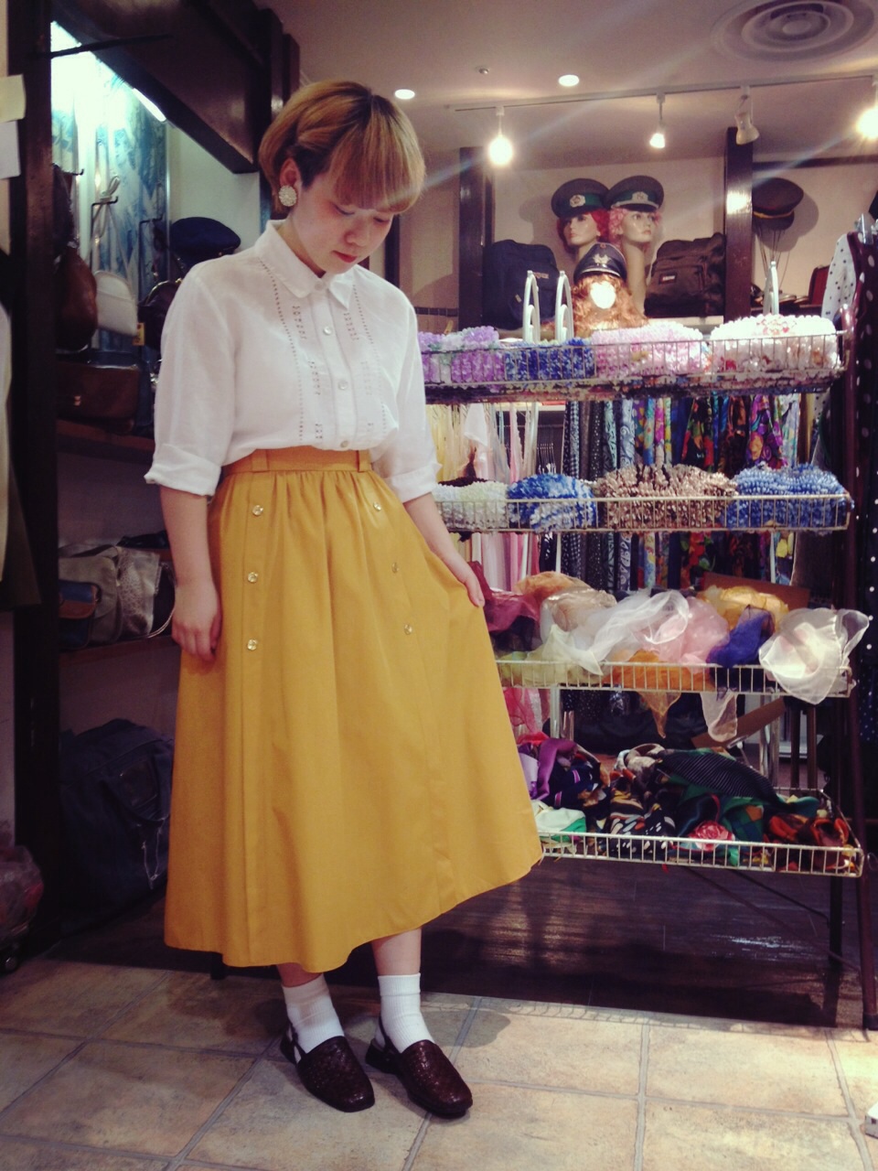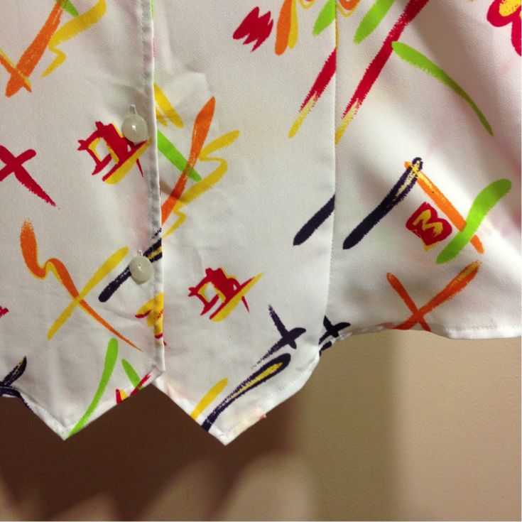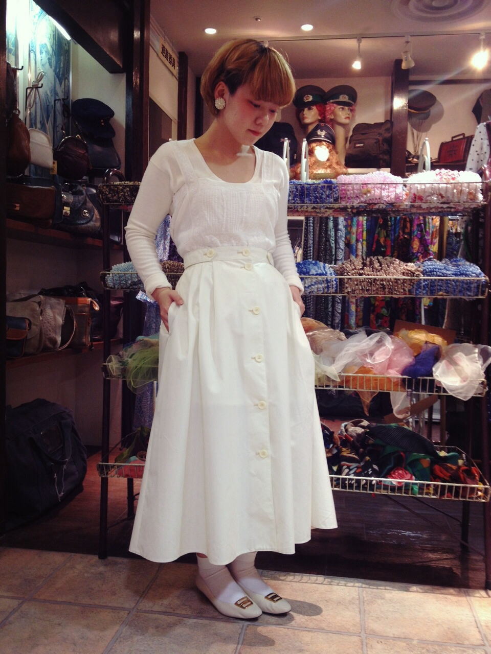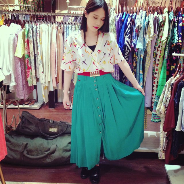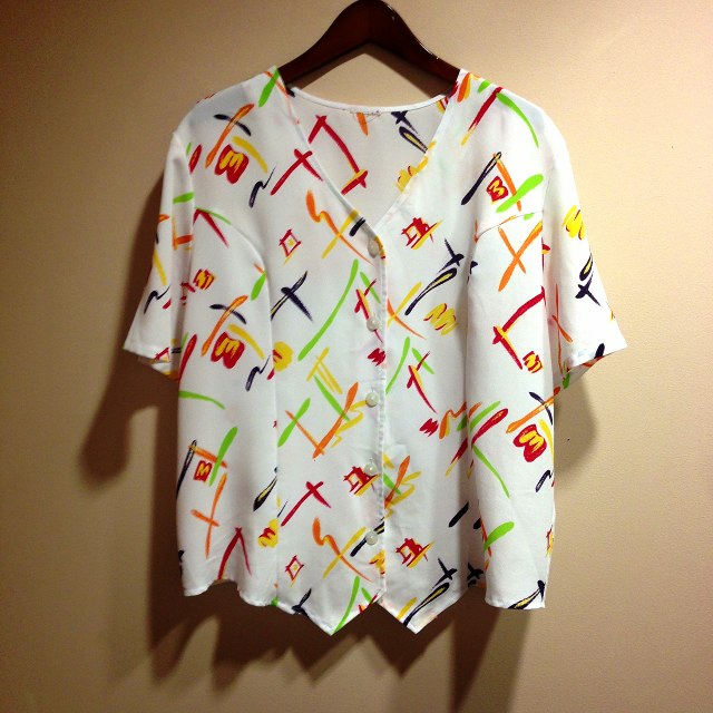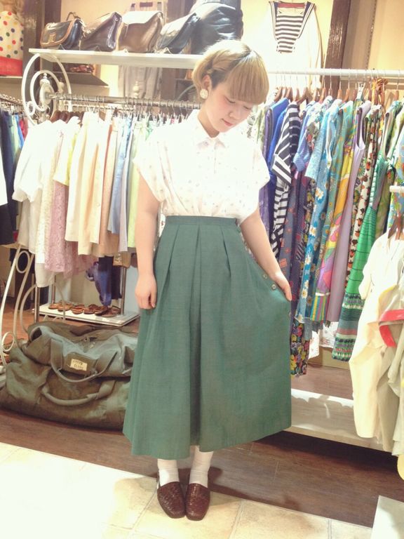 白地にPOPな色の柄がレトロ可愛いデザイン☆グリーンのフレアスカートと合わせて