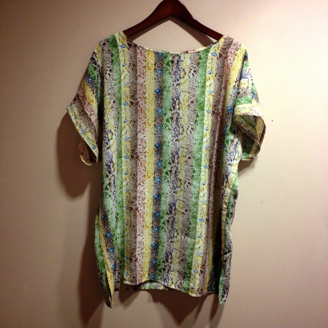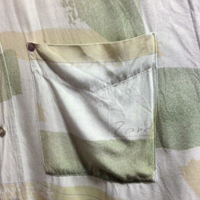 グリーン柄。ゆったりとしたサイズ感が◎ラフに緩めのパンツと合わせても、シャツインしてハイウエストでボトムスとも合わせやすい色合い