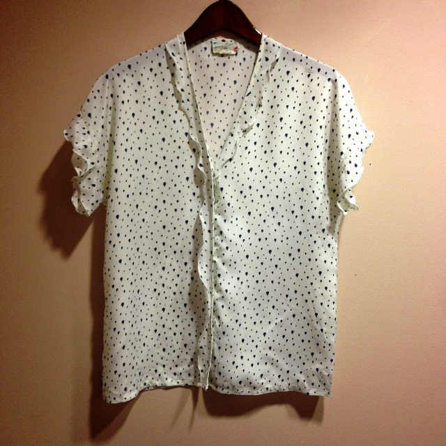雨のような柄に襟と袖がフリルでとても可愛らしいデザイン。ボトムスはプリーツスカート等キュートに合わせるのも素敵♡